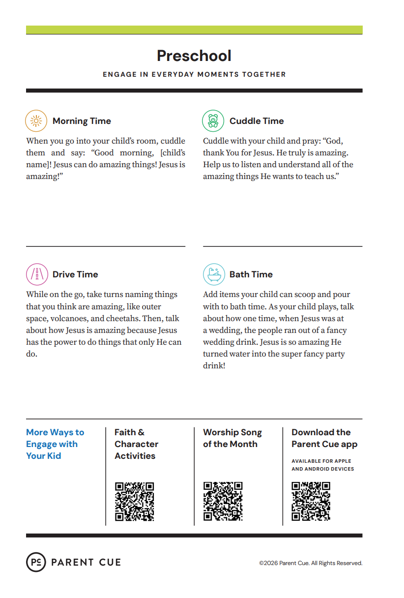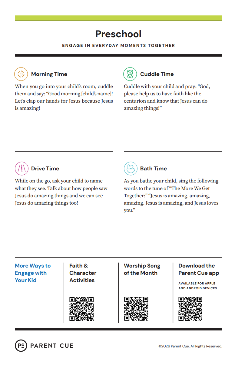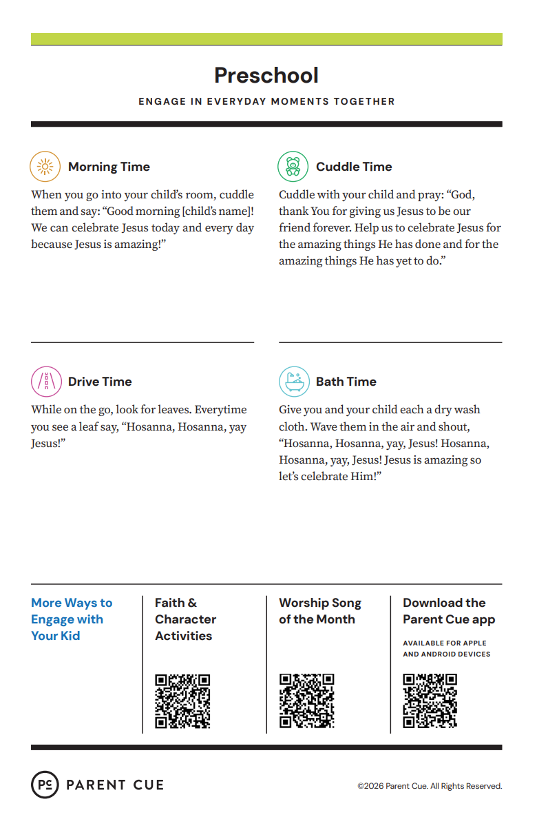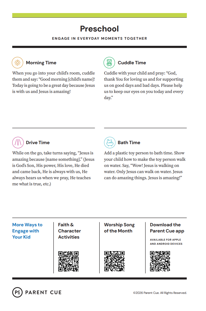 After you have completed the Check-In process & taken your child to his or her room, wave a quick good-bye & head into the adult worship service! As you know, it is common for little ones to cry when a parent leaves, and if this happens our volunteers will immediately engage your child in a toy or activity and ensure your child that you will return soon. If your child cries for an extended period of time or needs you for some reason, we will put your parent/guardian code on the top right hand corner of the auditorium screen!